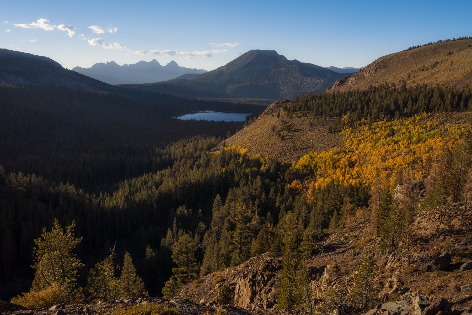 This is going to be a two part post, starting with a recent image in the Mammoth Lakes Basin. Dori decided to go on a hike that was new to her and found an overlook that she wanted to show me. The trail snakes through an aspen colony that stands out against a sea of pine. It had a lot of potential, so I made a note to check on the progress of the aspens changing color. On the first scouting trip, there was a band of greener aspen that made the colony look disconnected. Not great. Considering the different elements of the image, I’d need to wait for the color to progress.